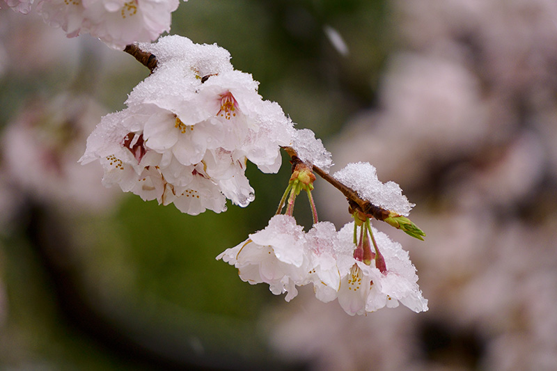 まだ雨が雪に変わって間もないので,桜の花は濡れて雫が滴っています。