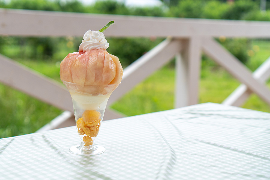 まるせい果樹園に併設されている「農家カフェ・森のガーデン」では,季節の果物をパフェにして出してくれるんです。もちろんこの季節は桃パフェです!