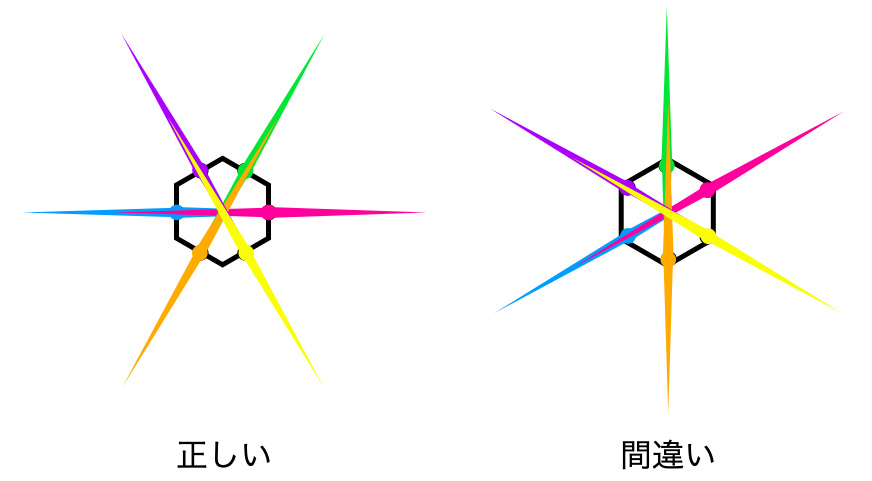 ここで注意するべきなのは,光条の出る方向です。光条は絞り羽根の縁から垂直に伸びるので,↑このような向きに伸びます。たまに光条が開口部の角に向かって伸びているような解説を見かけますが,それは間違いです(図4)。