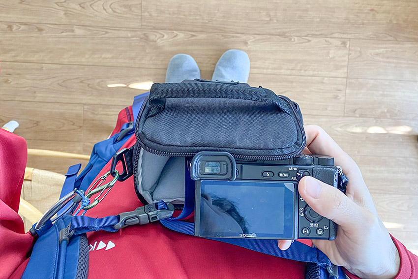カメラは,Sony の α6400。登山の時には,これに標準ズーム SEL1670Z (フルサイズ換算24–105 mm, F4通しのレンズです) をつけて歩くことが多いので,その状態で入れてみます。
