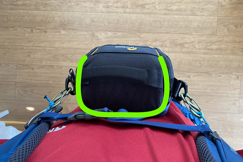 これを使って,バッグをザックのウエストハーネスやズボンの腰ベルトにつけることもできます。