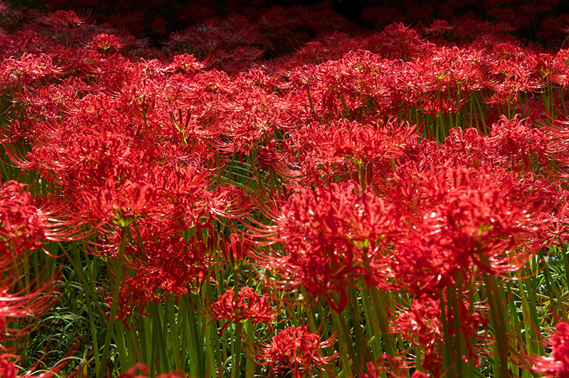 彼岸花畑の周りは森で仄暗いのに,その場所が輝いているみたいに感じられるのです。