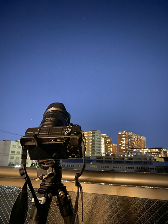 まずテスト撮影して撮影条件を決めます。東京都内なので空が明るく,すぐに白飛びしてしまいます。だからあまり長い露光時間は取れません。絞りもあまり開けられないですね。