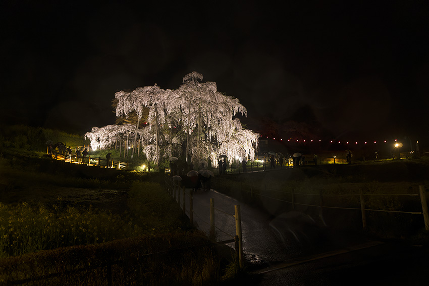 夜の滝桜を訪ねたのは4月15日,雨の日のことです。今年の桜めぐりの”締め”のつもりで行きました。